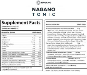 Other ingredients used in the Nagano Tonic include Cinnamon Cassia, Ashwagandha, Acerola, Eleuthero root, and Alfalfa leaf, along with an additional proprietary blend of 8 super antioxidants which are Beetroot, Wheat Grass, pomegranate, Blueberry, Cranberry, Reishi Mushroom, Spirulina, and Coconut Juice Powder.